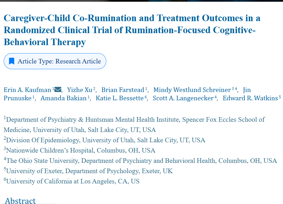 This publication looks at the relationship between a caregiver rumination, co-rumination, and how these may affect a caregiver’s views on their child’s psychopathology of interferes with their child’s treatment for their psychopathology. After looking at over 70 adolescents in RF-CBT or in treatment-as-usual, results indicate that caregiver-child co-rumination and caregiver rumination does not bias caregivers’ views of their child’s depression symptoms.