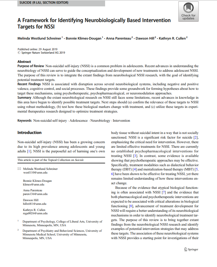 Advances in the neurobiological underpinnings of non-suicidal self-injury (NSSI) suggest that NSSI is associated with disruptions across several systems, such as cognitive control and social processes. These findings help build the foundation for how to target these mechanisms using psychotherapeutic, psychopharmacological, and neuromodulation methods. If you would like to read the full article, click the link below.